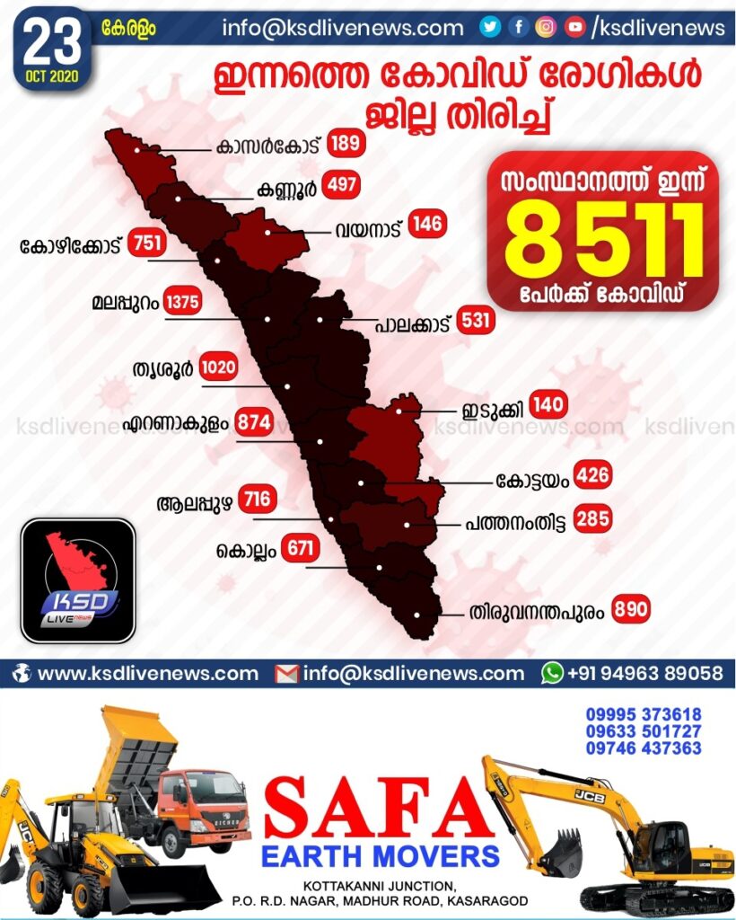 സംസ്ഥാനത്ത് ഇന്ന് 8511 പേര്‍ക്ക് കോവിഡ്-19 സ്ഥിരീകരിച്ചു. മലപ്പുറം 1375, തൃശൂര്‍ 1020, തിരുവനന്തപുരം 890, എറണാകുളം 874, കോഴിക്കോട് 751, ആലപ്പുഴ 716, കൊല്ലം 671, പാലക്കാട് 531, കണ്ണൂര്‍ 497, കോട്ടയം 426, പത്തനംതിട്ട 285, കാസര്‍ഗോഡ് 189, വയനാട് 146, ഇടുക്കി 140 എന്നിങ്ങനേയാണ് ജില്ലകളില്‍ ഇന്ന് രോഗ ബാധ സ്ഥിരീകരിച്ചത്.