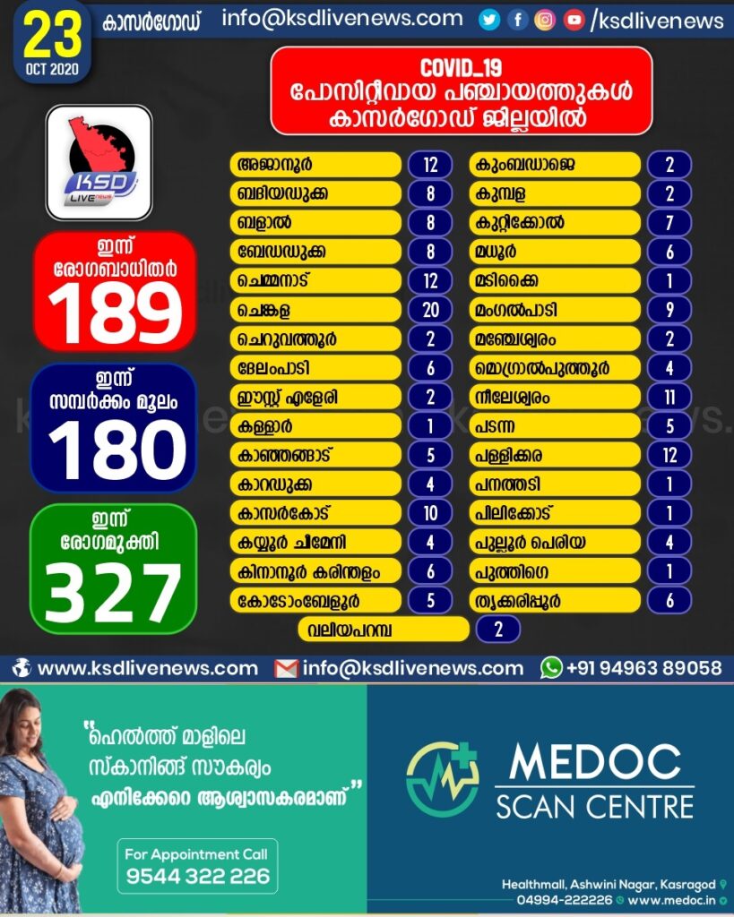 കാസർഗോഡ് ജില്ലയിൽ ഇന്ന് കോവിഡ് പോസിറ്റീവായവരുടെ പഞ്ചായത്ത് തിരിച്ചുള്ള സ്ഥിതി വിവര കണക്ക്