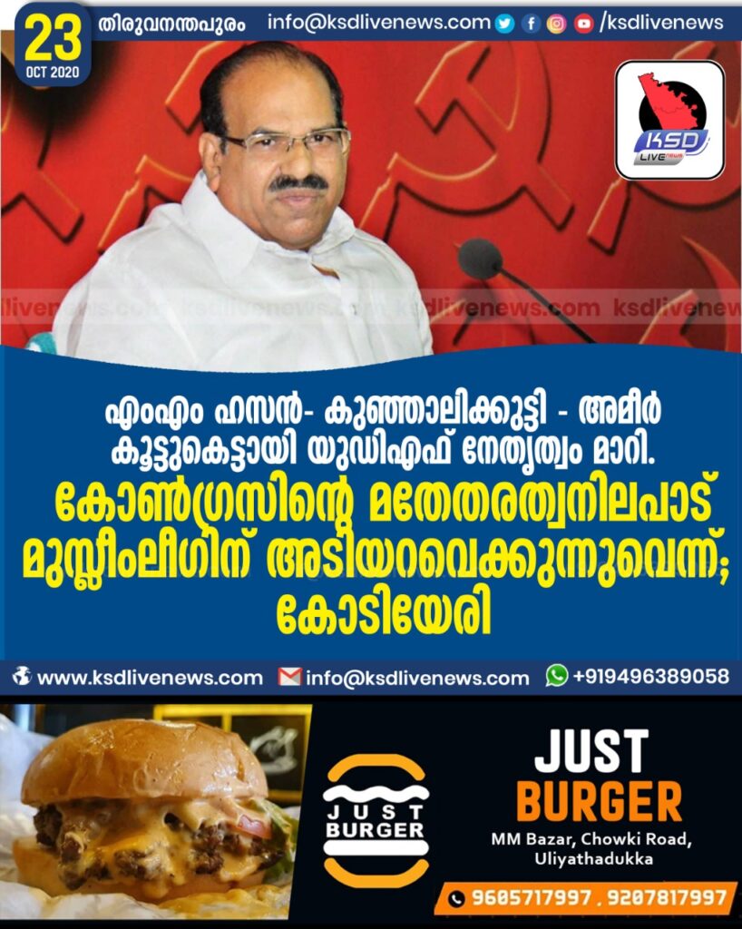 തിരുവനന്തപുരം: കോണ്ഗ്രസിന്റെ മതേതരത്വനിലപാട് മുസ്ലീംലീഗിന് അടിയറവെക്കുന്നുവെന്ന് സിപിഎം സംസ്ഥാന സെക്രട്ടറി കോടിയേരി ബാലകൃഷ്ണന്. എംഎം ഹസന്- കുഞ്ഞാലിക്കുട്ടി – അമീര് കൂട്ടുകെട്ടായി യുഡിഎഫ നേതൃത്വം മാറി. ലീഗിനെ നയിക്കുന്നത് ജമാഅത്തെ ഇസ്ലാമിയുടെ പ്രത്യയശാസ്ത്രമാണെന്നും കോടിയേരി പറഞ്ഞു.