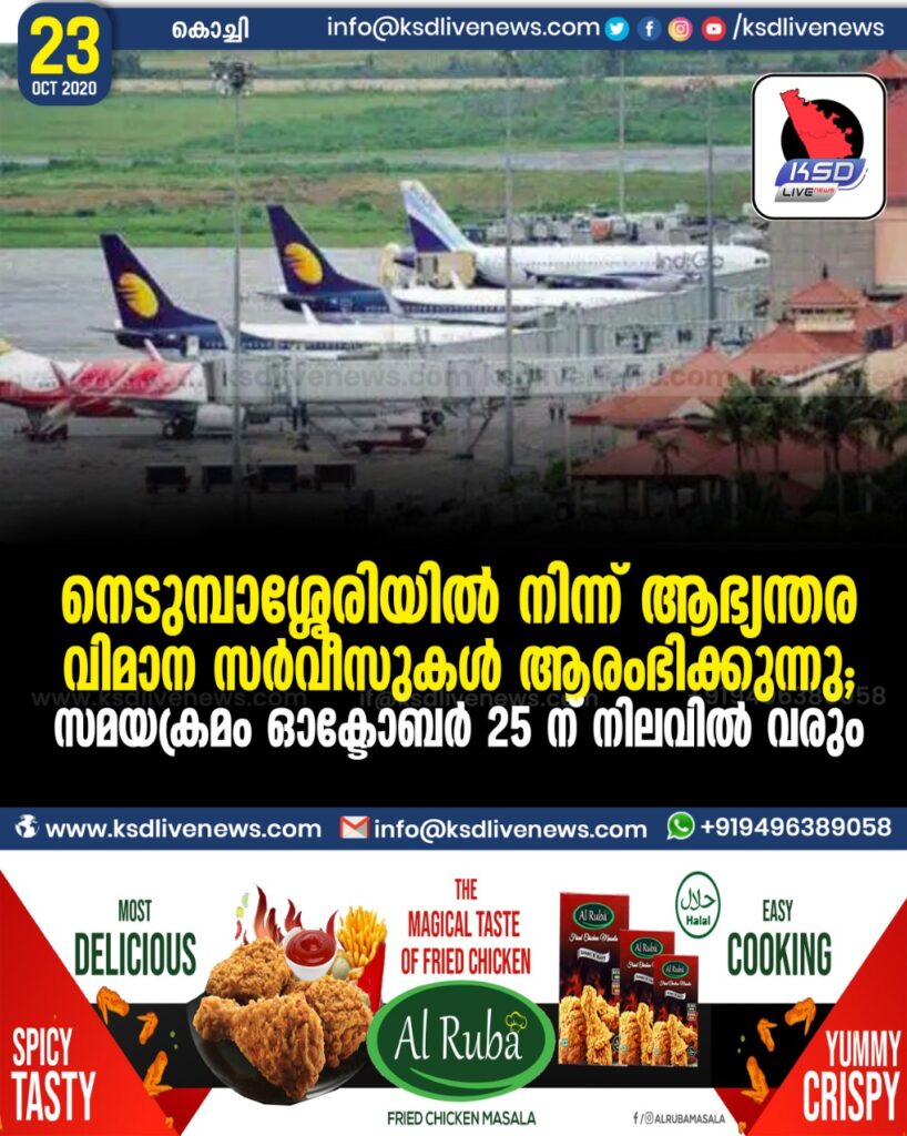 നെടുമ്പാശ്ശേരിയിൽ നിന്ന് ആഭ്യന്തര വിമാന സർവീസുകൾ ആരംഭിക്കുന്നു ; സമയക്രമം ഓക്ടോബർ 25 ന് നിലവിൽ വരും