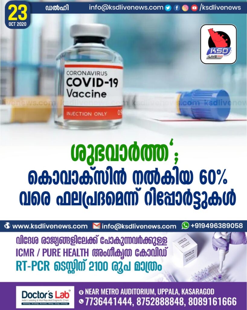 ശുഭവാർത്ത ” ; കൊവാക്സിൻ നൽകിയ 60 % വരെ ഫലപ്രദമെന്ന് റിപ്പോർട്ടുകൾ