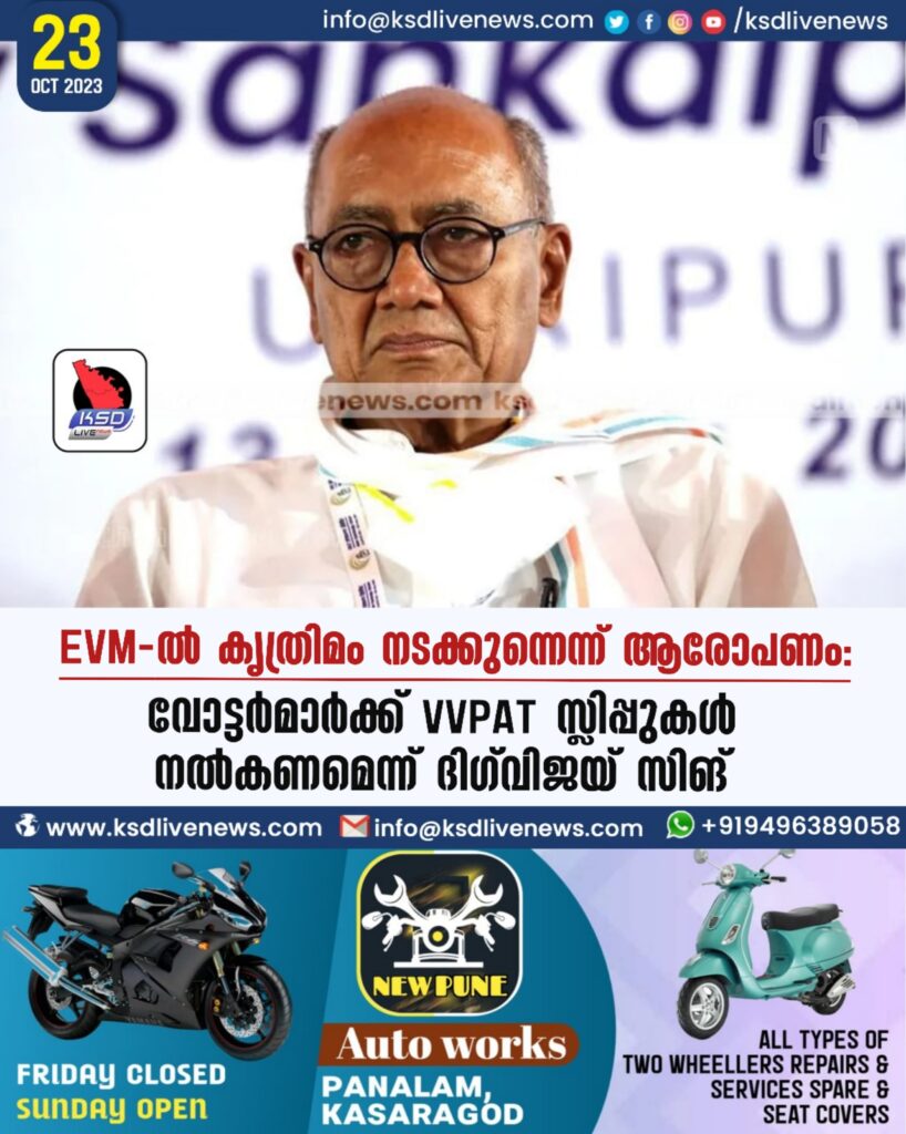 EVM-ൽ കൃത്രിമം നടക്കുന്നെന്ന് ആരോപണം: വോട്ടർമാർക്ക് VVPAT സ്ലിപ്പുകൾ നൽകണമെന്ന് ദിഗ്‌വിജയ്‌ സിങ്‌