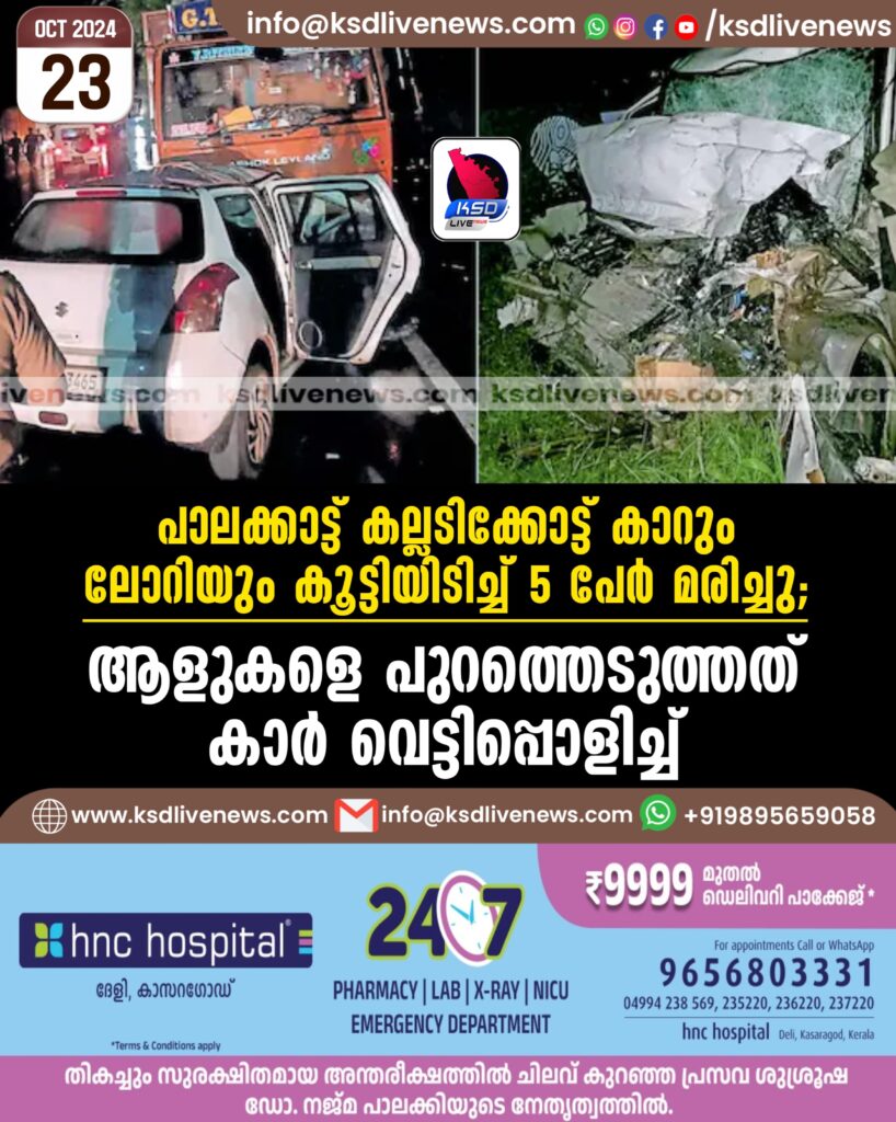പാലക്കാട്ട് കല്ലടിക്കോട്ട് കാറും ലോറിയും കൂട്ടിയിടിച്ച് 5 പേർ മരിച്ചു; ആളുകളെ പുറത്തെടുത്തത് കാർ വെട്ടിപ്പൊളിച്ച്