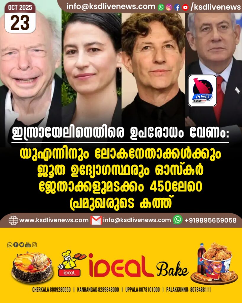 ‘ഇസ്രായേലിനെതിരെ ഉപരോധം വേണം’; യുഎന്നിനും ലോകനേതാക്കള്ക്കും ജൂത ഉദ്യോഗസ്ഥരും ഓസ്കര് ജേതാക്കളുമടക്കം 450ലേറെ പ്രമുഖരുടെ കത്ത്