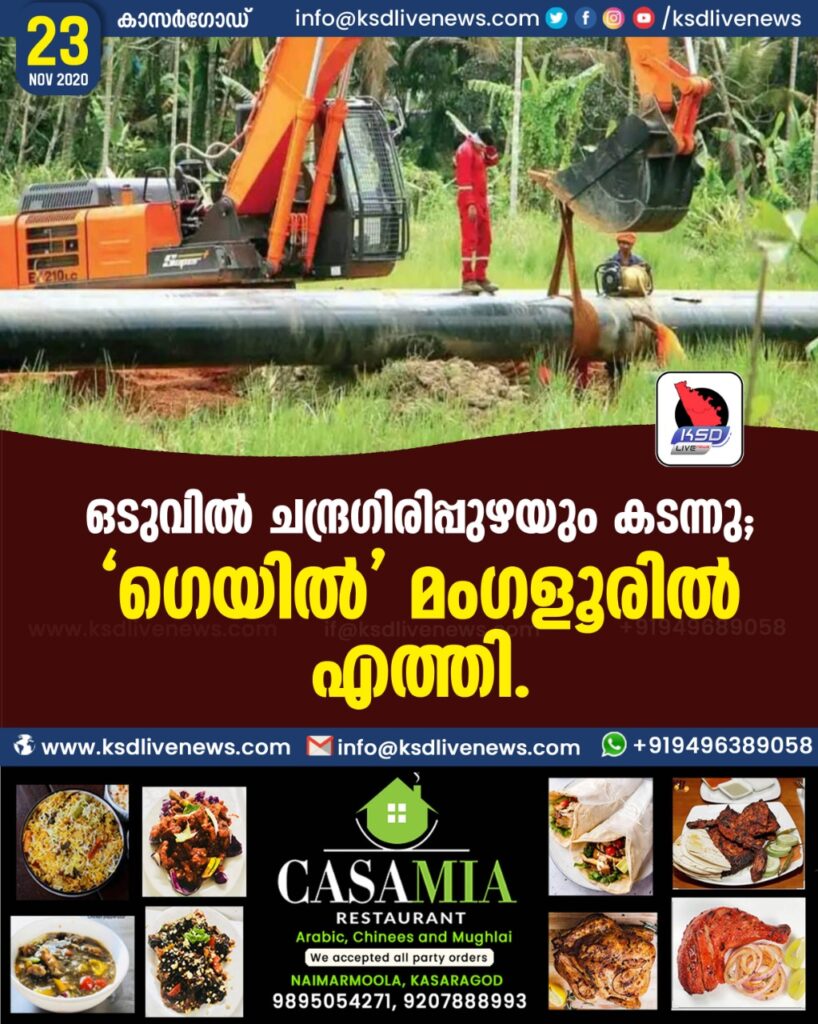 ഒടുവിൽ ചന്ദ്രഗിരിപ്പുഴയും കടന്നു ; ‘ ഗെയിൽ ‘ മംഗളൂരിൽ എത്തി .