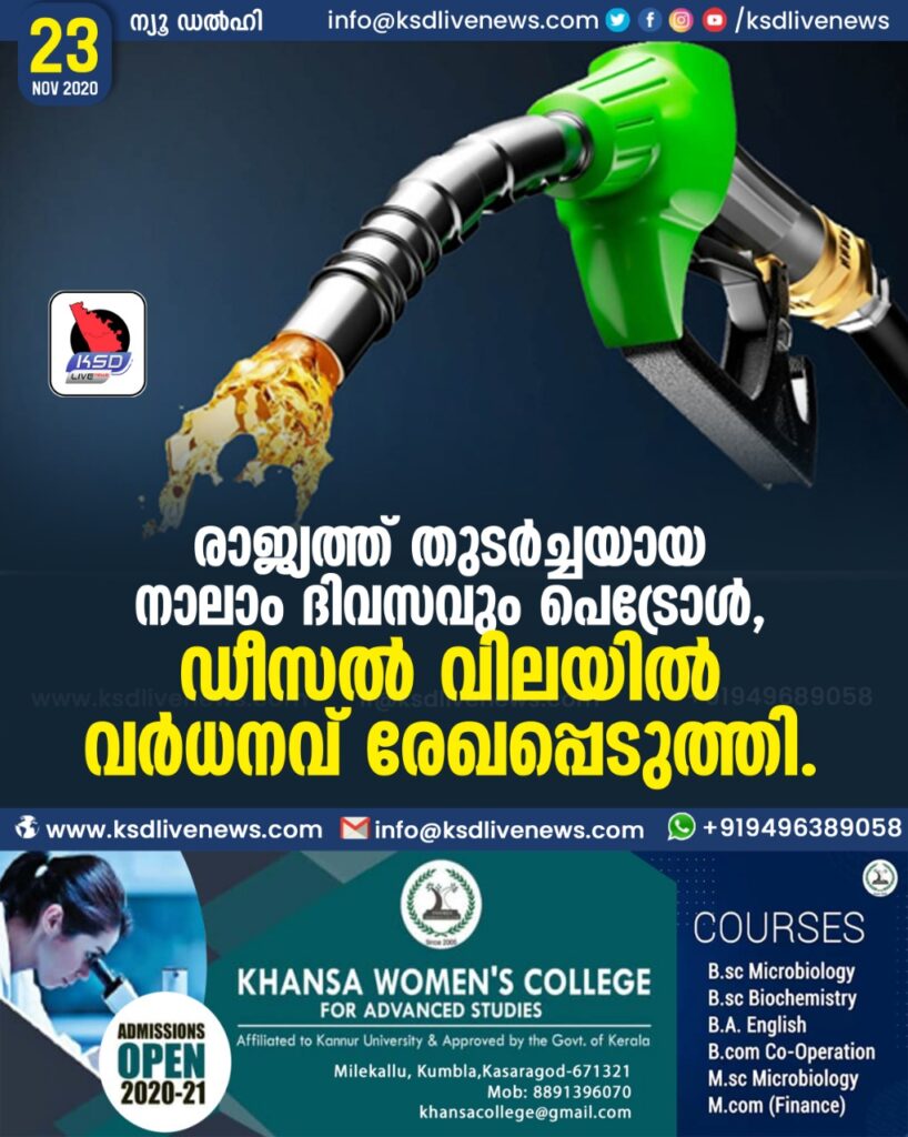 രാജ്യത്ത് തുടർച്ചയായ നാലാം ദിവസവും പെട്രോൾ , ഡീസൽ വിലയിൽ വർധനവ് രേഖപ്പെടുത്തി .