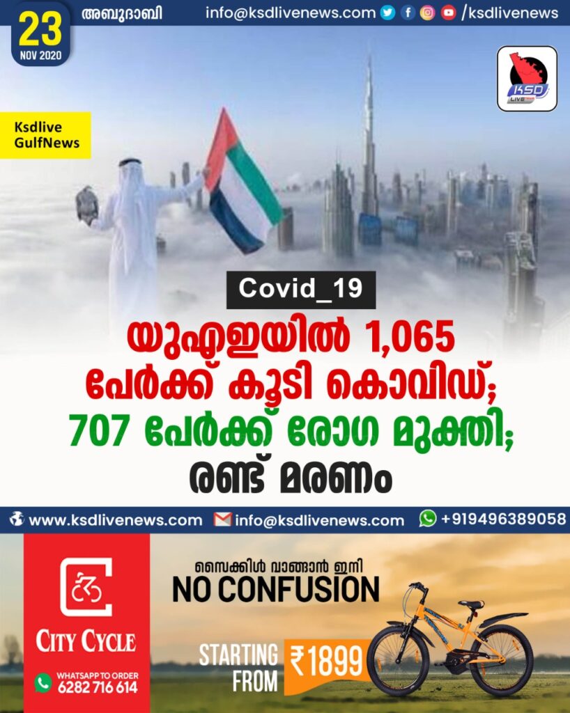 യുഎഇയില്‍ 1,065 പേര്‍ക്ക് കൂടി കൊവിഡ് ; 707പേർക്ക് രോഗ മുക്തി ; രണ്ട് മരണം