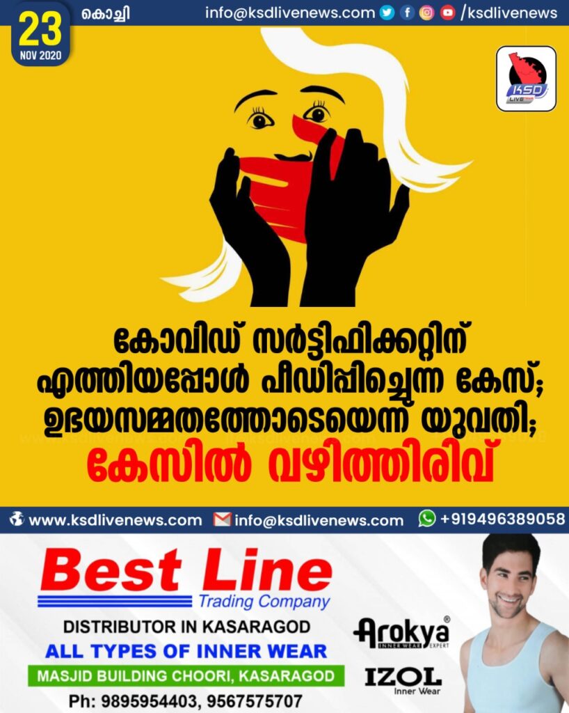 കോവിഡ് സര്‍ട്ടിഫിക്കറ്റിന് എത്തിയപ്പോള്‍ പീഡിപ്പിച്ചെന്ന കേസ്; ഉഭയസമ്മതത്തോടെയെന്ന് യുവതി ;