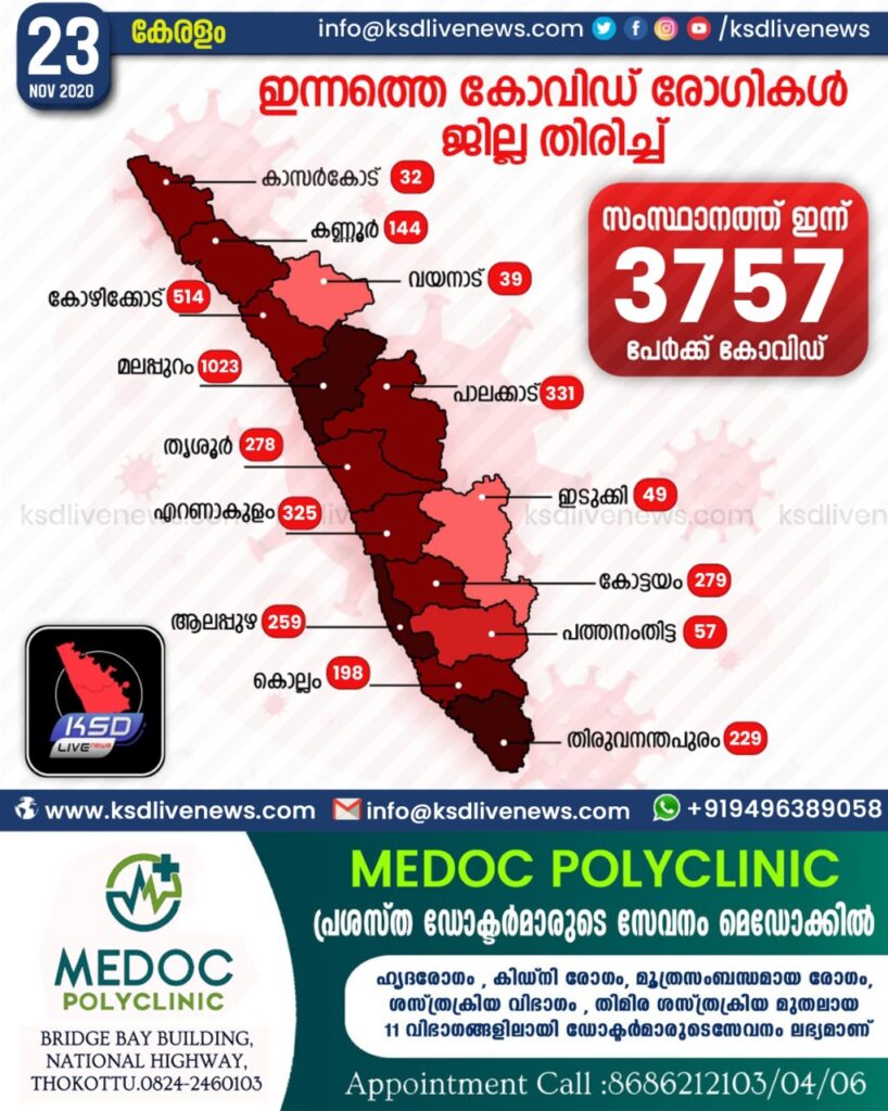സംസ്ഥാനത്ത് ഇന്ന് 3757 പേര്‍ക്ക് കോവിഡ്-19 സ്ഥിരീകരിച്ചു. മലപ്പുറം 1023, കോഴിക്കോട് 514, പാലക്കാട് 331, എറണാകുളം 325, കോട്ടയം 279, തൃശൂര്‍ 278, ആലപ്പുഴ 259, തിരുവനന്തപുരം 229, കൊല്ലം 198, കണ്ണൂര്‍ 144, പത്തനംതിട്ട 57, ഇടുക്കി 49, വയനാട് 39, കാസര്‍ഗോഡ് 32 എന്നിങ്ങനേയാണ് ജില്ലകളില്‍ ഇന്ന് രോഗ ബാധ സ്ഥിരീകരിച്ചത്.