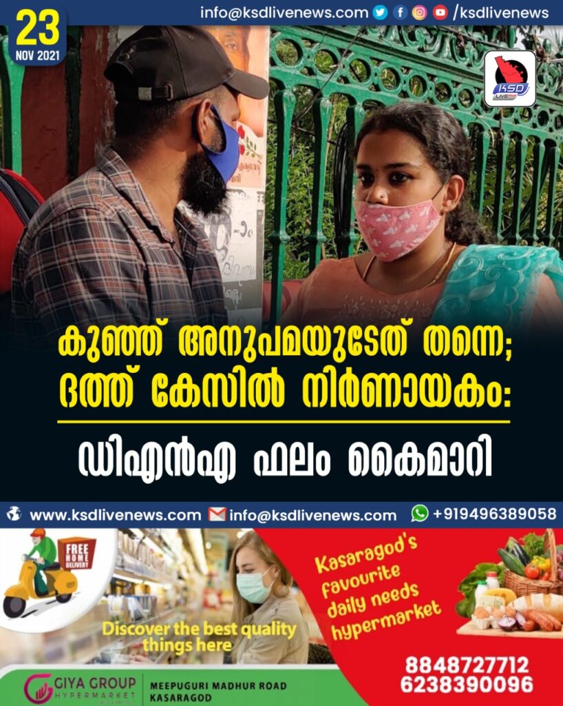 തിരുവനന്തപുരം∙ അമ്മയറിയാതെ കുഞ്ഞിനെ ദത്തു നല്‍കിയ കേസില്‍ ഡിഎന്‍എ പരിശോധന ഫലം സിഡബ്ല്യുസിക്ക് കൈമാറി. കുഞ്ഞ് അനുപമയുടേത് തന്നെയെന്നു തെളിഞ്ഞു. ഡിഎന്‍എ പരിശോധനയില്‍ മൂന്നു പേരുടെയും ഫലം പോസിറ്റീവായി. ഈ റിപ്പോര്‍ട്ട് സിഡബ്ല്യുസി കോടതിയില്‍ സമര്‍പ്പിക്കും. രാജീവ് ഗാന്ധി സെന്റര്‍ ഫോര്‍ ബയോടെക്‌നോളജിയാണ് കുഞ്ഞിന്റെ സാംപിള്‍ പരിശോധിച്ച് ഡിഎന്‍എ റിപ്പോര്‍ട്ട് സിഡബ്ല്യുസിക്ക് കൈമാറിയത്. അതേസമയം സമരപ്പന്തലില്‍ അനുപമ മിഠായി വിതരണം ചെയ്തു. ഡിഎന്‍എ റിപ്പോര്‍ട്ടിലെ വിവരങ്ങള്‍ തനിക്കു നല്‍കണമെന്ന് ആവശ്യപ്പെട്ട് അനുപമ സിഡബ്ല്യുസിക്ക് കത്തു നല്‍കിയിട്ടുണ്ട്.