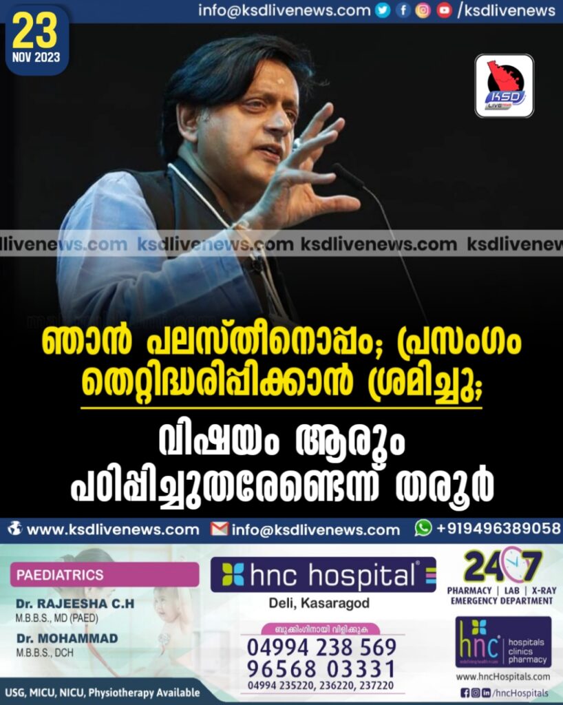 ‘ഞാൻ പലസ്തീനൊപ്പം, പ്രസംഗം തെറ്റിദ്ധരിപ്പിക്കാൻ ശ്രമിച്ചു’; വിഷയം ആരും പഠിപ്പിച്ചുതരേണ്ടെന്ന് തരൂർ