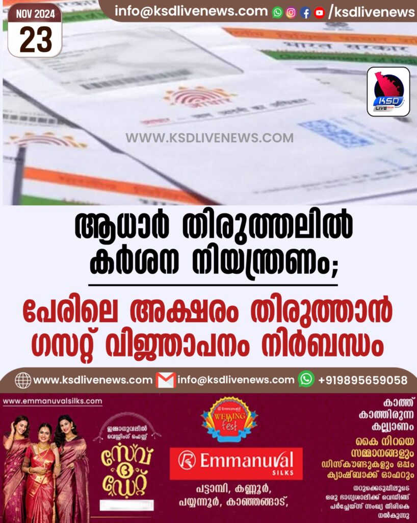ആധാർ തിരുത്തലിൽ കർശന നിയന്ത്രണം; പേരിലെ അക്ഷരം തിരുത്താൻ ഗസറ്റ് വിജ്ഞാപനം നിർബന്ധം