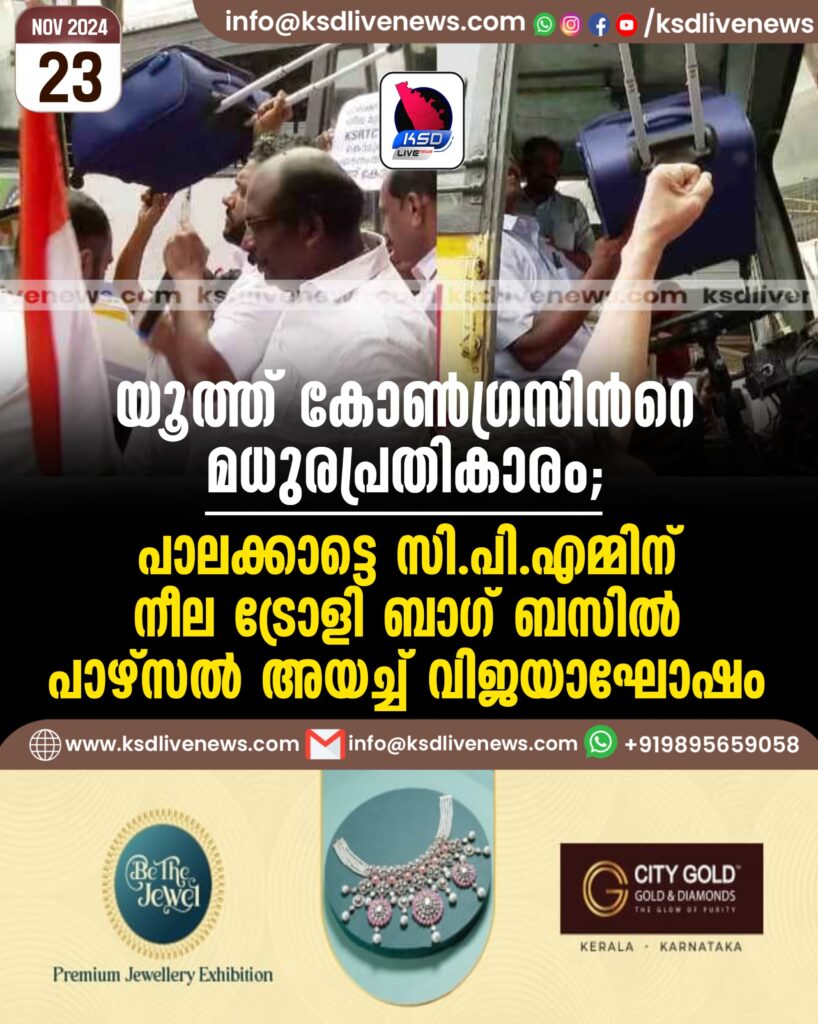 ‘യൂത്ത് കോണ്‍ഗ്രസിന്‍റെ മധുരപ്രതികാരം’; പാലക്കാട്ടെ സിപിഎമ്മിന് നീല ട്രോളി ബാഗ് ബസില്‍ പാഴ്സല്‍ അയച്ച്‌ വിജയാഘോഷം