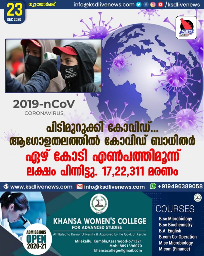 പിടിമുറുക്കി കോവിഡ്….. ആഗോളതലത്തിൽ കോവിഡ് ബാധിതർ ഏഴ് കോടി എണ്‍പത്തിമൂന്ന് ലക്ഷം പിന്നിട്ടു. 17,22,311 മരണം