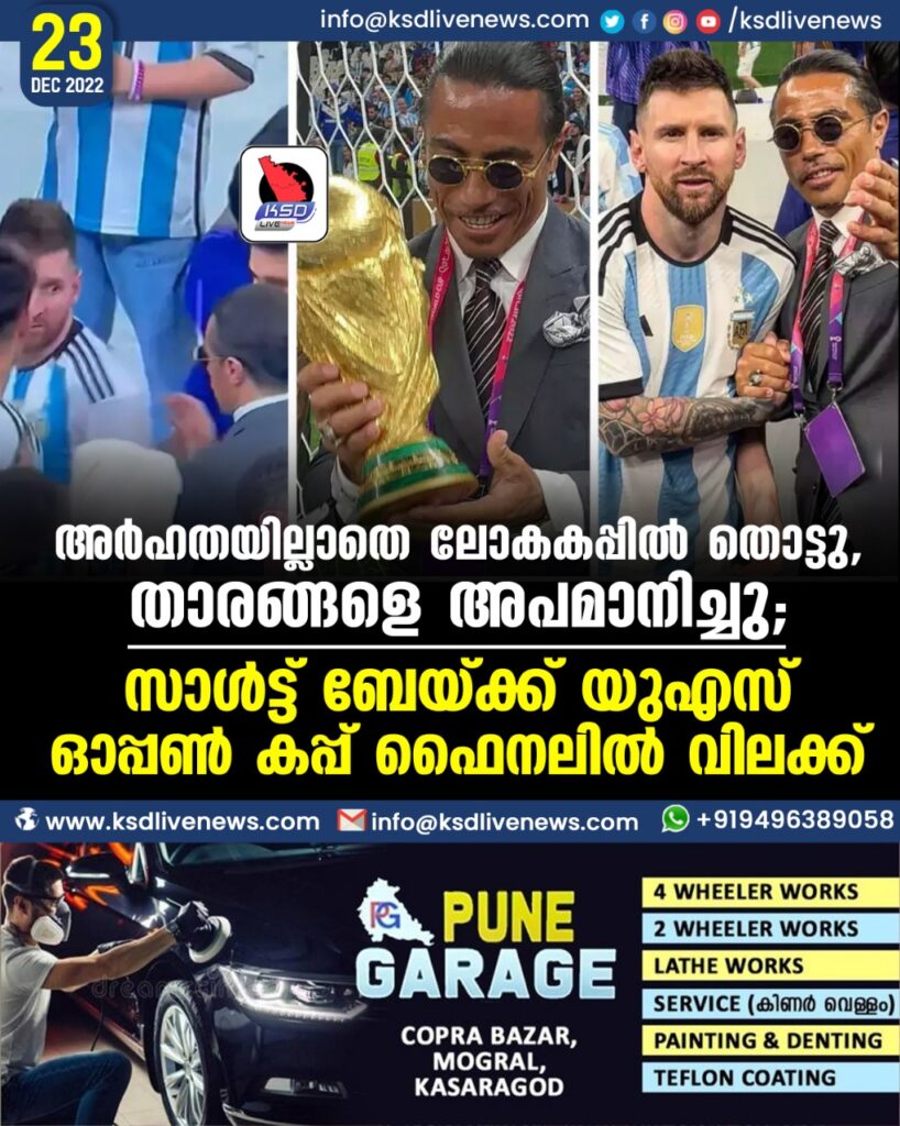 അര്ഹതയില്ലാതെ ലോകകപ്പ് ട്രോഫി കയ്യിലെടുത്ത് ആരാധകരെ ചൊടിപ്പിച്ച തുര്ക്കി ഷെഫ് ‘സാള്ട്ട് ബേ’ എന്നറിയപ്പെടുന്ന നസ്ര്-എറ്റ് ഗോക്സെയെ യുഎസ് ഓപ്പണ് കപ്പ് ഫൈനലില് നിന്ന് വിലക്കി. 1914ല് തുടങ്ങിയ അമേരിക്കയിലെ ഏറ്റവും പഴക്കമേറിയതും പ്രൗഡഗംഭീരവുമായ സോക്കര് ടൂര്ണമെന്റാണ് യു.എസ് ഓപ്പണ് കപ്പ്. ഫിഫ ലോകകപ്പ് ഫൈനല് മത്സരത്തിന് ശേഷം സാള്ട്ട് ബേയ് ബഹളമുണ്ടാക്കിയെന്നും ഫിഫയുടെ സുപ്രധാന നിയമം ലംഘിക്കുകയും ചെയ്തെന്ന് ചൂണ്ടിക്കാട്ടിയാണ് നടപടി.