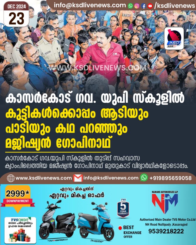 കാസർകോട്: ആടിയും പാടിയും കഥ പറഞ്ഞും കുട്ടികളോടൊപ്പം ചെലവഴിച്ച് മജിഷ്യൻ ഗോപിനാഥ്. കുട്ടികളിൽ സർഗാത്മകവും ഉത്തരവാദിത്ത ബോധവും സാമൂഹിക പ്രതിബദ്ധതയും വളർത്തി കുടുംബത്തിലും സമൂഹത്തിലും ഉത്തമ പൗരന്മാരായി വളർത്തിയെടുക്കുക എന്ന ലക്ഷ്യത്തോടെ നടപ്പാക്കുന്ന ‘ചൈൽഡ് ആൻഡ് പൊലീസ്’ പദ്ധതി ജില്ലയിൽ തുടങ്ങുന്നതിന്റെ മുന്നോടിയായി കാസർകോട് ഗവ. യുപി സ്കൂളിൽ നടത്തിയ ‘തുടിപ്പ്’ സഹവാസ ക്യാംപിലാണ് മജീഷ്യൻ ഗോപിനാഥ് കുട്ടികളോടൊപ്പം കൂടാനെത്തിയത്. കുട്ടികളുടെ ചോദ്യത്തിനു മറുപടിയും വഴി തെറ്റാതെ പോകാനുള്ള വിദ്യയും നൽകി 2 മണിക്കൂറിലേറെ ചെലവഴിച്ചതാണ് മജിഷ്യന് മടങ്ങിയത്.