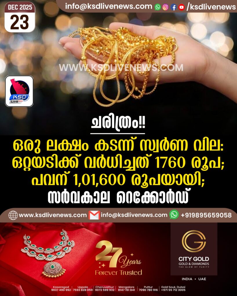 ചരിത്രം!! ഒരു ലക്ഷം കടന്ന് സ്വർണ വില: ഒറ്റയടിക്ക് വര്ധിച്ചത് 1760 രൂപ; പവന് 1,01,600 രൂപയായി; സര്വകാല റെക്കോര്ഡ്