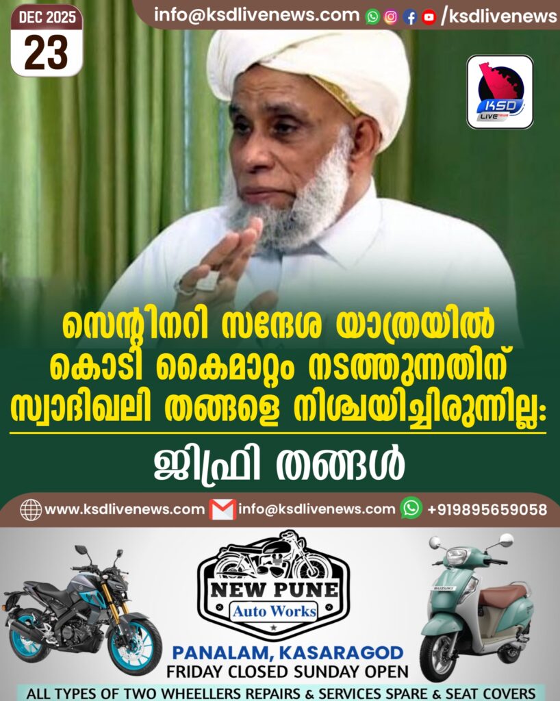 ഇടുക്കി/കോഴിക്കോട്: സെന്റിനറി യാത്രയില് കൊടി കൈമാറ്റം നടത്തുന്നതിന് പാണക്കാട് സ്വാദിഖലി തങ്ങളെ നിശ്ചയിച്ചിട്ടില്ലെന്ന് ഇ കെ വിഭാഗം പ്രസിഡന്റ് സയ്യിദ് ജിഫ്രി മുത്തുക്കോയ തങ്ങള്.