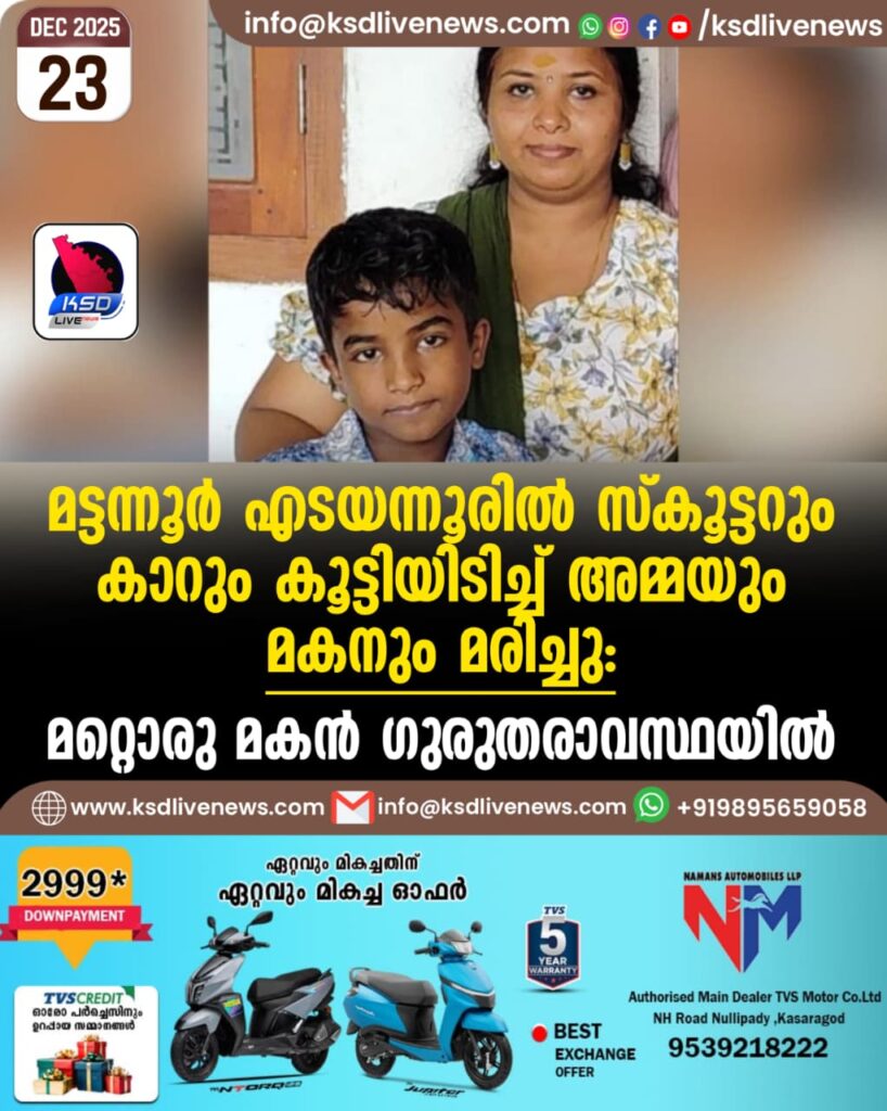 മട്ടന്നൂർ എടയന്നൂരിൽ സ്കൂട്ടറും കാറും കൂട്ടിയിടിച്ച് അമ്മയും മകനും മരിച്ചു, മറ്റൊരു മകൻ ഗുരുതരാവസ്ഥയിൽ