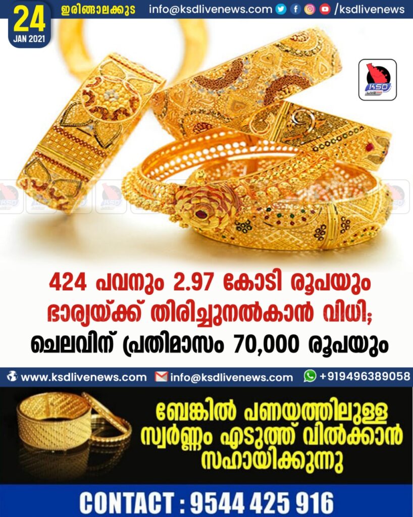 424 പവനും 2.97 കോടി രൂപയും ഭാര്യയ്ക്ക് തിരിച്ചുനൽകാൻ വിധി; ചെലവിന് പ്രതിമാസം 70,000 രൂപയും