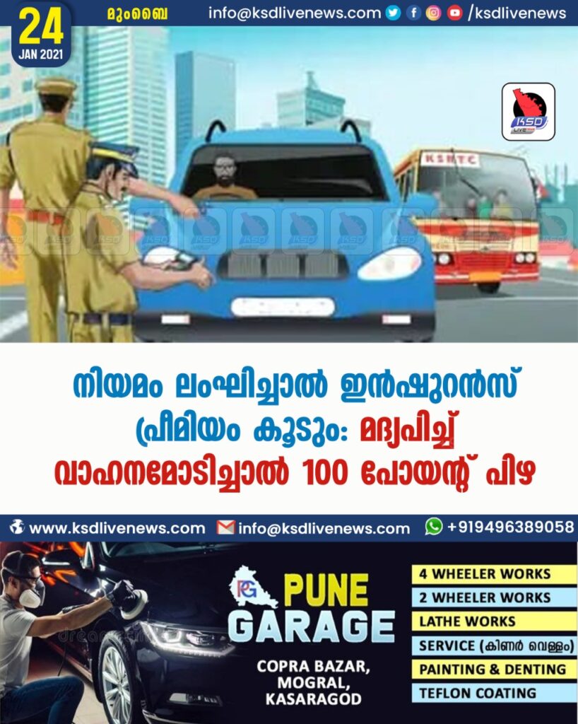 നിയമം ലംഘിച്ചാല്‍ ഇന്‍ഷുറന്‍സ് പ്രീമിയം കൂടും: മദ്യപിച്ച് വാഹനമോടിച്ചാല്‍ 100 പോയന്റ് പിഴ