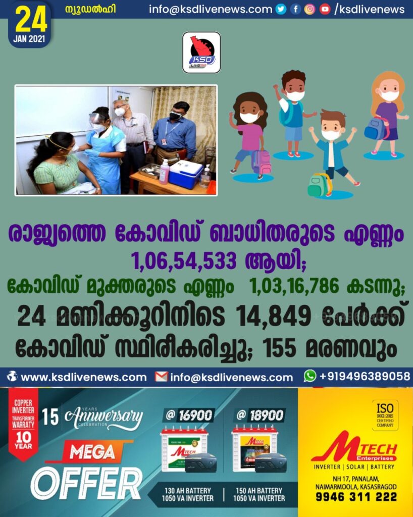 രാജ്യത്തെ കോവിഡ് ബാധിതരുടെ എണ്ണം 1,06,54,533 ആയി ; കോവിഡ് മുക്തരുടെ എണ്ണം 1,03,16,786 കടന്നു ;