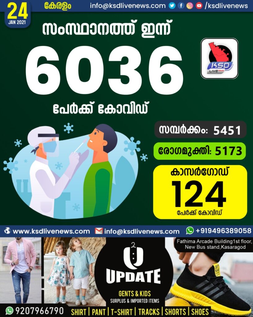 സംസ്ഥാനത്ത് ഇന്ന് 6036 പേർക്ക് കോവിഡ് സ്ഥിരീകരിച്ചു. സമ്പർക്കം വഴി 5451 പേർക്കും ; ആശ്വാസമായി 5173 പേർക്ക് രോഗ മുക്തിയും ; കാസർഗോഡ് ജില്ലയിൽ 124 പേർക്ക് പുതിയ കോവിഡ് കേസുകൾ ; മരണം 20