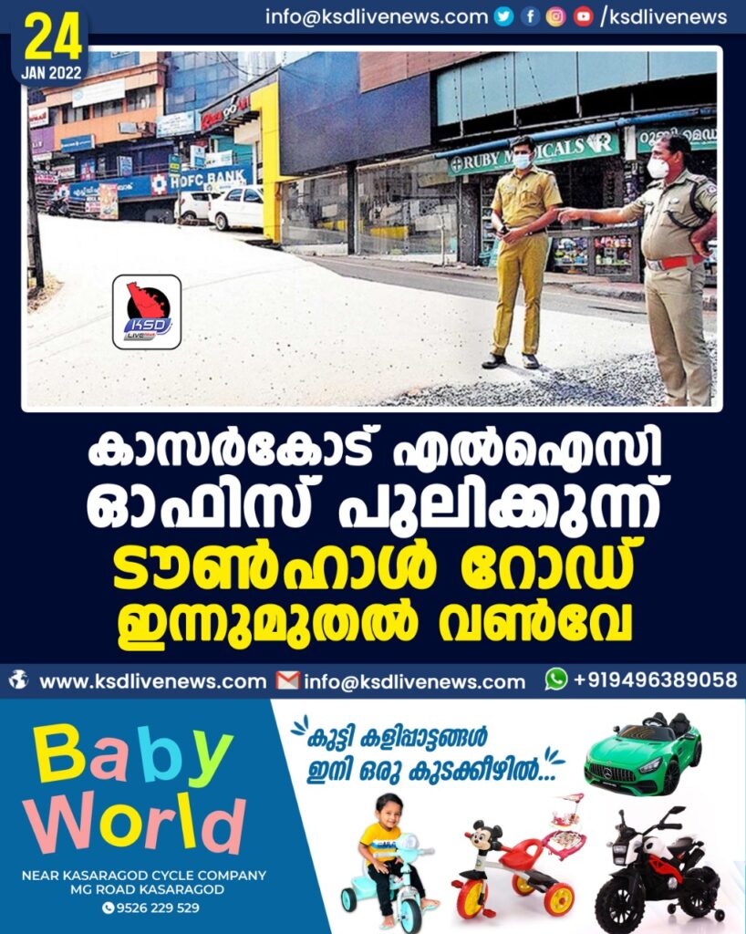 കാസർകോട് എൽഐസി ഓഫിസ്– പുലിക്കുന്ന് ടൗൺഹാൾ റോഡ് ഇന്നുമുതൽ വൺവേ