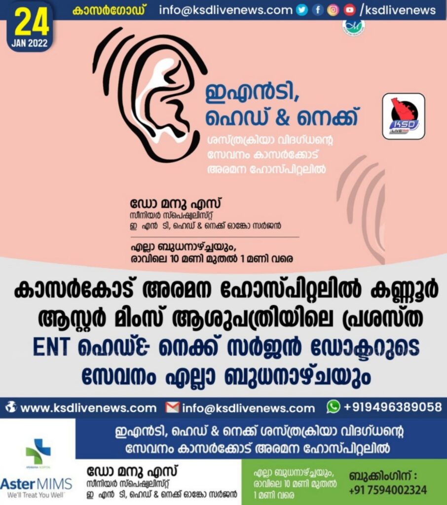 കാസർകോട് അരമന ഹോസ്പിറ്റലിൽ കണ്ണൂർ ആസ്റ്റർ മിംസ് ആശുപത്രിയിലെ പ്രശസ്ത ENT ഹെഡ്& നെക്ക് * വിദക്ത ഡോക്ടറുടെ സേവനം എല്ലാ ബുധനാഴ്ചയും