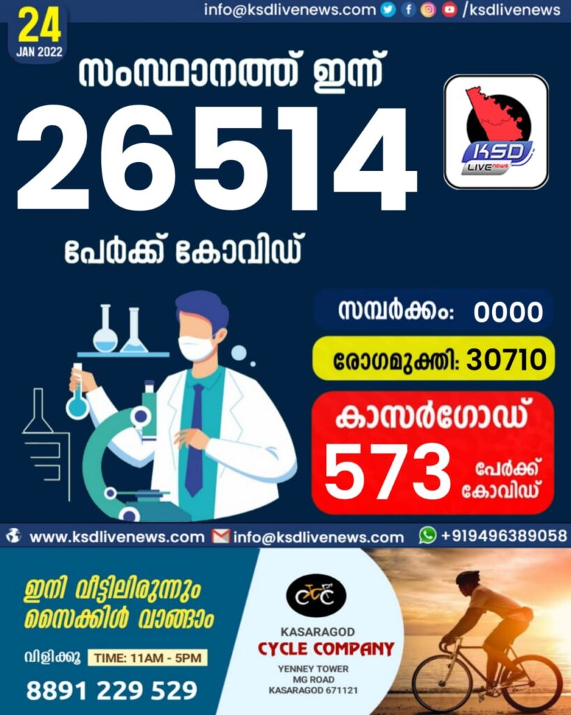 സംസ്ഥാനത്ത് ഇന്ന് 26,514 പേർക്ക് കോവിഡ് സ്ഥിരീകരിച്ചു. ആശ്വാസമായി 30, 710 പേർക്ക് രോഗമുക്തി ; കാസർഗോഡ് ജില്ലയിൽ 573 പേർക്ക് പുതിയ കോവിഡ് കേസുകൾ ; മരണം 13
