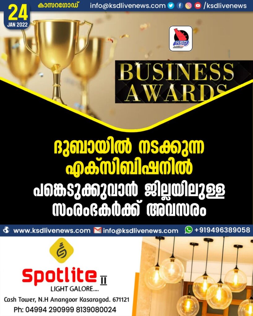 കാസർഗോഡ്: കാസർകോട് ചേംബർ ഓഫ് കൊമേഴ്സ് ആൻഡ് ഇൻഡസ്ട്രിസ് കാസർഗോഡ് ജില്ലയിലെ സംരംഭകർക്ക് അവരുടെ ഉൽപ്പന്നത്തിന് വിദേശരാജ്യങ്ങളിൽ വിപണി കണ്ടെത്തുന്നതിനായി ദുബായിൽ എക്സിബിഷൻ നടത്തുന്നു കാസർഗോഡ് ജില്ലയിലെ സംരംഭകർക്ക് മുൻതൂക്കം, കാസർഗോഡ് ജില്ലയിൽ ഉൽപ്പാദിപ്പിക്കുന്ന ഉൽപ്പന്നങ്ങൾ വിദേശ രാജ്യങ്ങളിൽ വിപണി കണ്ടെത്തുന്നതോടൊപ്പം ജില്ലയിൽ നിന്നും കയറ്റുമതി ബിസിനസിലേക്കുള്ള അവസരങ്ങൾ ലഭിക്കുവാനും ഈ എക്സിബിഷൻ കാരണമാകും.