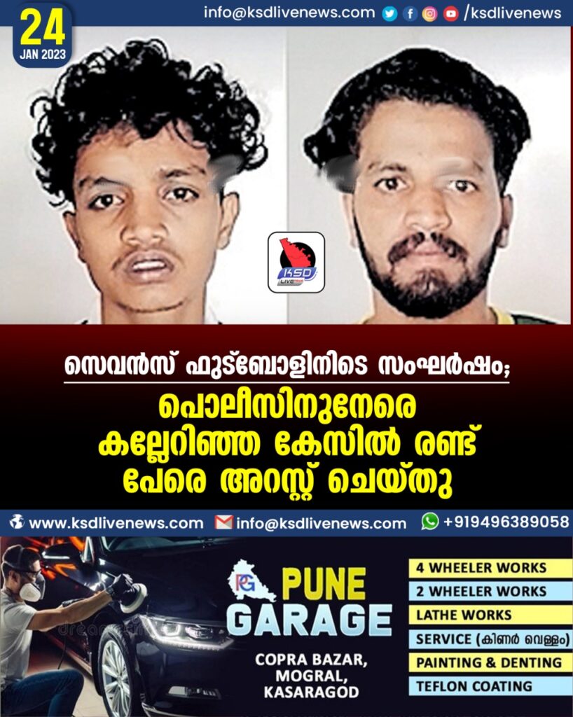 “ഉദുമ ∙ പള്ളത്തെ സെവൻസ് ഫുട്ബോൾ ടൂർണമെന്റിലെ  വിജയ അഹ്ലാദത്തിനിടെ വിജയികളായ ക്ലബ് അംഗങ്ങളും വൊളന്റിയർമാരും തമ്മിലുണ്ടായ  വാക്കേറ്റം ഉന്തും തള്ളലിലും കലാശിച്ചു. ഇവരെ പിന്തിരിപ്പിക്കാൻ ശ്രമിച്ച പൊലീസിനു നേരെ കല്ലേറുണ്ടായി. കല്ലേറിൽ ഒരു പൊലീസുകാരന്റെ പല്ല് കൊഴി‍ഞ്ഞു.  സംഭവവുമായി ബന്ധപ്പെട്ട് 3 പേരടക്കം കണ്ടാലറിയാവുന്ന 50 പേർക്കെതിരെ കേസെടുത്തു. 2 പേരെ അറസ്റ്റ് ചെയ്തു.ബേക്കൽ സ്റ്റേഷനിലെ സിവിൽ പോലീസ് ഓഫിസർ അരമങ്ങാനത്തെ  പ്രശോഭിന്റെ പല്ലാണ് കല്ലേറിൽ കൊഴിഞ്ഞത്. കാഞ്ഞങ്ങാട് കല്ലൂരാവി ബാവാ നഗർ അമീറലി മൻസിലിലെ അമീർ അലി (21), ബാവ നഗർ കെസി ഹൗസിലെ മുഹമ്മദ് ഇംത്യാസ്( 24) എന്നിവരെയാണ് അറസ്റ്റ് ചെയ്തത്.  ബാവാ നഗർ ബ്രദേഴ്സ് ക്ലബിന്റെ  മാനേജർ മൊയ്തു അടക്കം കണ്ടാലറിയാവുന്ന 50 പേർക്കെതിരെയാണ്  ബേക്കൽ പൊലീസ് കേസെടുത്തത്. ഇതിൽ ഏഴു പേരെ തിരിച്ചറിഞ്ഞതായി  ബേക്കൽ ഇൻസ്പെക്ടർ യു.പി.വിപിൻ പറഞ്ഞു.ചിത്താരി ഹസീന ക്ലബ്ബ് ഉദുമ പള്ളത്ത് സംഘടിപ്പിക്കുന്ന മെട്രോ കപ്പ്  സെവൻസ് ഫുട്ബോൾ മത്സരത്തിനിടയിൽ ഞായറാഴ്ച രാത്രി 11 മണിക്കാണ്  സംഭവം. ബ്രദേഴ്സ്  ബാവാ നഗറും കാറാമ മൊഗ്രാൽ പുത്തൂരും തമ്മിലായിരുന്നു മത്സരം. കളിയിൽ ഏകപക്ഷീയമായ ഒരു ഗോളിന് ബ്രദേഴ്സ്  ബാവാ നഗർ ജയിച്ചു. മത്സരത്തിന് ശേഷം മൈതാനത്ത് അഹ്ലാദം പ്രകടനം നടത്തിയ ബാവനഗറിലെത്തിയ ഒരു സംഘം  വൊളന്റിയർമാരും  തമ്മിൽ  തർക്കമുണ്ടായി. ഇവരെ  പൊലീസ് എത്തി ഓടിച്ചു.  പിന്നീട്  തുടർന്ന് സ്റ്റേഡിയത്തിന് പുറത്ത് സംഘടിച്ച ജയിച്ച ടീമിനൊപ്പം വന്നവർ  കല്ലെറിഞ്ഞതോടെ പൊലീസ് അക്രമികളെ വിരട്ടിയോടിക്കുകയായിരുന്നു. സംഭവ സ്ഥലത്ത് നിന്നും ഒരു സ്കൂട്ടറും കസ്റ്റഡിയിലെടുത്തിട്ടുണ്ട്. ആക്രമിച്ചവരെ പിടികൂടാൻ പ്രത്യേക  പൊലീസ് സംഘം  വീടുകളിൽ  പരിശോധന നടത്തുന്നുണ്ട്.” https://www.manoramaonline.com/district-news/kasargod/2023/01/24/attack-aginst-police-in-sevens-foot-ball-tournament-udma-kasargod.html#:~:text=%E0%B4%89%E0%B4%A6%E0%B5%81%E0%B4%AE%20%E2%88%99%20%E0%B4%AA%E0%B4%B3%E0%B5%8D%E0%B4%B3%E0%B4%A4%E0%B5%8D%E0%B4%A4%E0%B5%86%20%E0%B4%B8%E0%B5%86%E0%B4%B5%E0%B5%BB%E0%B4%B8%E0%B5%8D%20%E0%B4%AB%E0%B5%81%E0%B4%9F%E0%B5%8D%E0%B4%AC%E0%B5%8B%E0%B5%BE%20%E0%B4%9F%E0%B5%82%E0%B5%BC%E0%B4%A3%E0%B4%AE%E0%B5%86%E0%B4%A8%E0%B5%8D%E0%B4%B1%E0%B4%BF%E0%B4%B2%E0%B5%86%C2%A0%20%E0%B4%B5%E0%B4%BF%E0%B4%9C%E0%B4%AF,%E0%B4%B5%E0%B5%80%E0%B4%9F%E0%B5%81%E0%B4%95%E0%B4%B3%E0%B4%BF%E0%B5%BD%C2%A0%20%E0%B4%AA%E0%B4%B0%E0%B4%BF%E0%B4%B6%E0%B5%8B%E0%B4%A7%E0%B4%A8%20%E0%B4%A8%E0%B4%9F%E0%B4%A4%E0%B5%8D%E0%B4%A4%E0%B5%81%E0%B4%A8%E0%B5%8D%E0%B4%A8%E0%B5%81%E0%B4%A3%E0%B5%8D%E0%B4%9F%E0%B5%8D.
