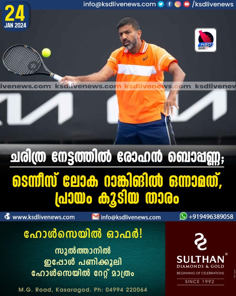 ചരിത്ര നേട്ടത്തിൽ രോഹൻ ബൊപ്പണ്ണ; ടെന്നീസ് ലോക റാങ്കിങിൽ ഒന്നാമത്, പ്രായം കൂടിയ താരം