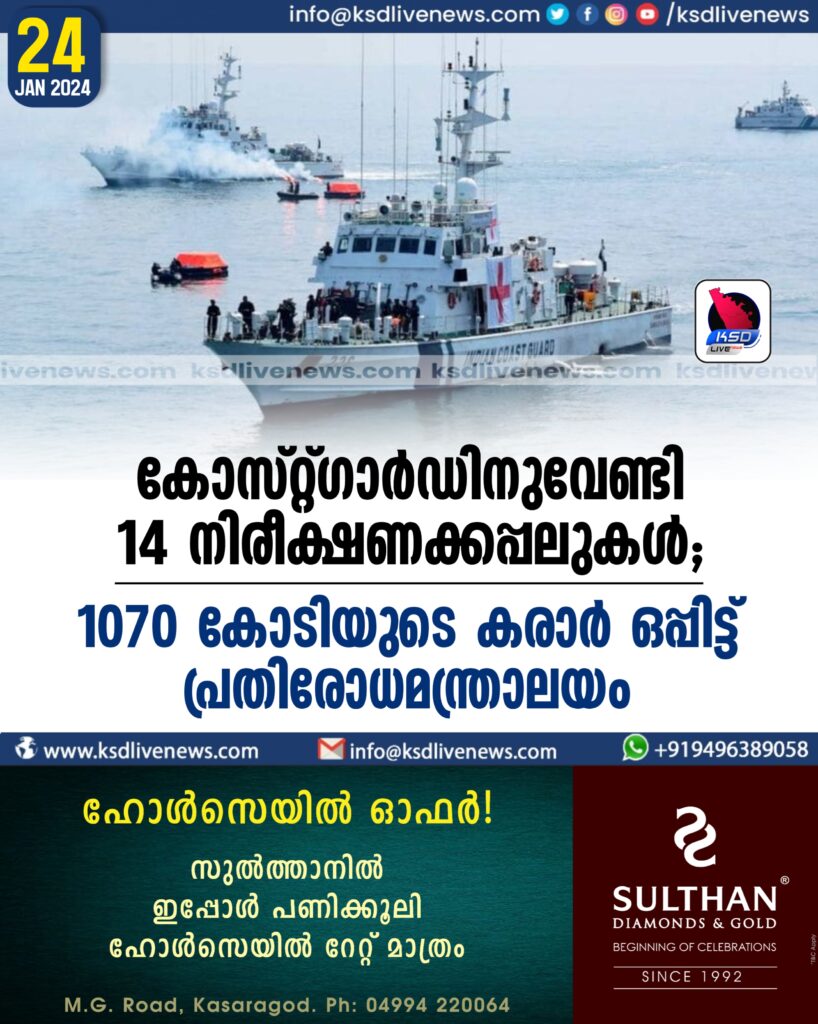 കോസ്റ്റ്ഗാർഡിനുവേണ്ടി 14 നിരീക്ഷണക്കപ്പലുകൾ; 1070 കോടിയുടെ കരാർ ഒപ്പിട്ട് പ്രതിരോധമന്ത്രാലയം
