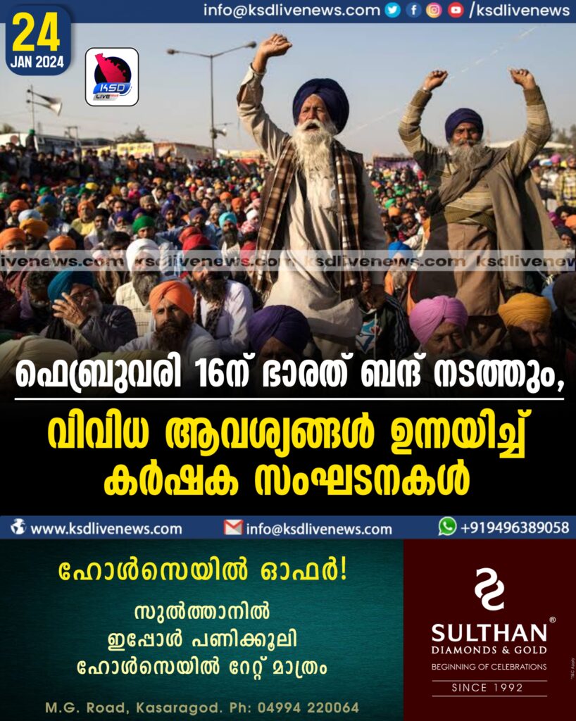 ഫെബ്രുവരി 16ന് ഭാരത് ബന്ദ് നടത്തും, വിവിധ ആവശ്യങ്ങള്‍ ഉന്നയിച്ച്‌ കര്‍ഷക സംഘടനകള്‍/