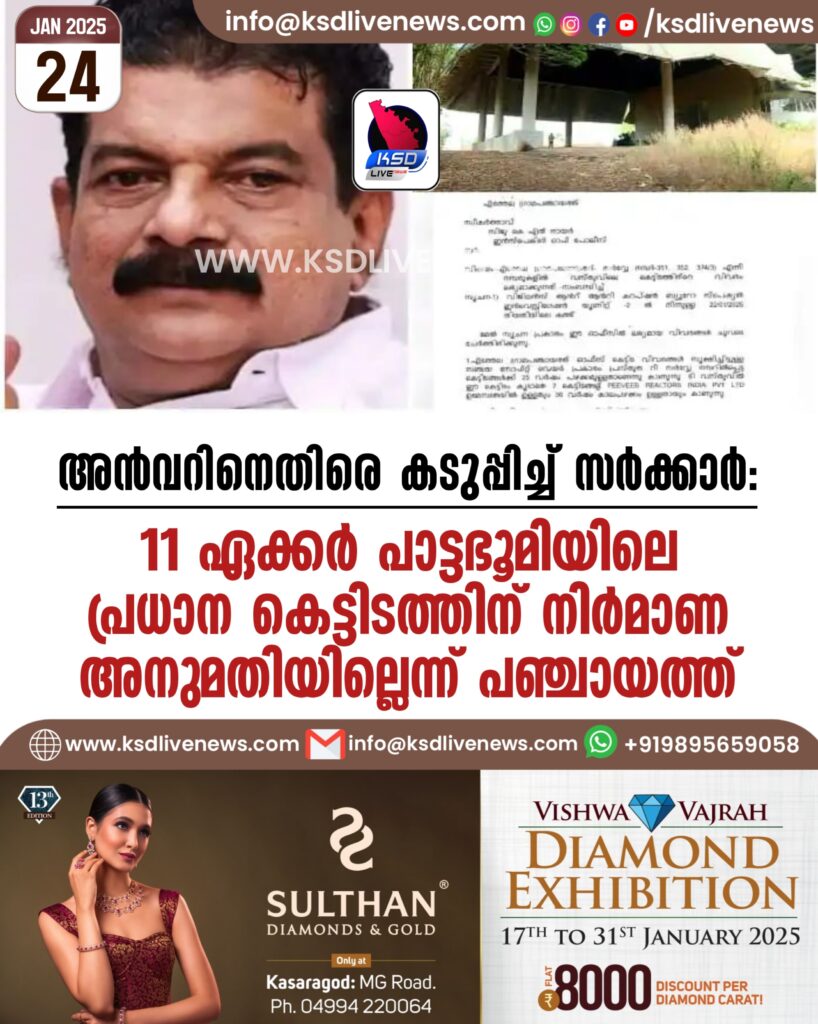 അൻവറിനെതിരെ കടുപ്പിച്ച് സര്ക്കാര്,11 ഏക്കര് പാട്ടഭൂമിയിലെ പ്രധാന കെട്ടിടത്തിന് നിര്മാണ അനുമതിയില്ലെന്ന് പഞ്ചായത്ത്