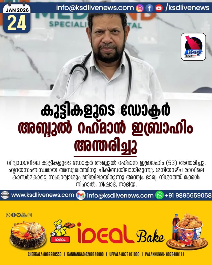 കാസർകോട്: വിദ്യാനഗറിലെ കുട്ടികളുടെ ഡോക്ടർ അബ്ദുൽ റഹ്മാൻ ഇബ്രാഹിം (53) അന്തരിച്ചു. ഹൃദയസംബന്ധമായ അസുഖത്തിനു ചികിത്സയിലായിരുന്നു. ശനിയാഴ്ച രാവിലെ കാസർകോട്ടെ സ്വകാര്യാശുപത്രിയിലായിരുന്നു അന്ത്യം. ഭാര്യ: നിശാത്ത്. മക്കൾ: നിഹാൽ, നിഷാദ്, നാദിയ.