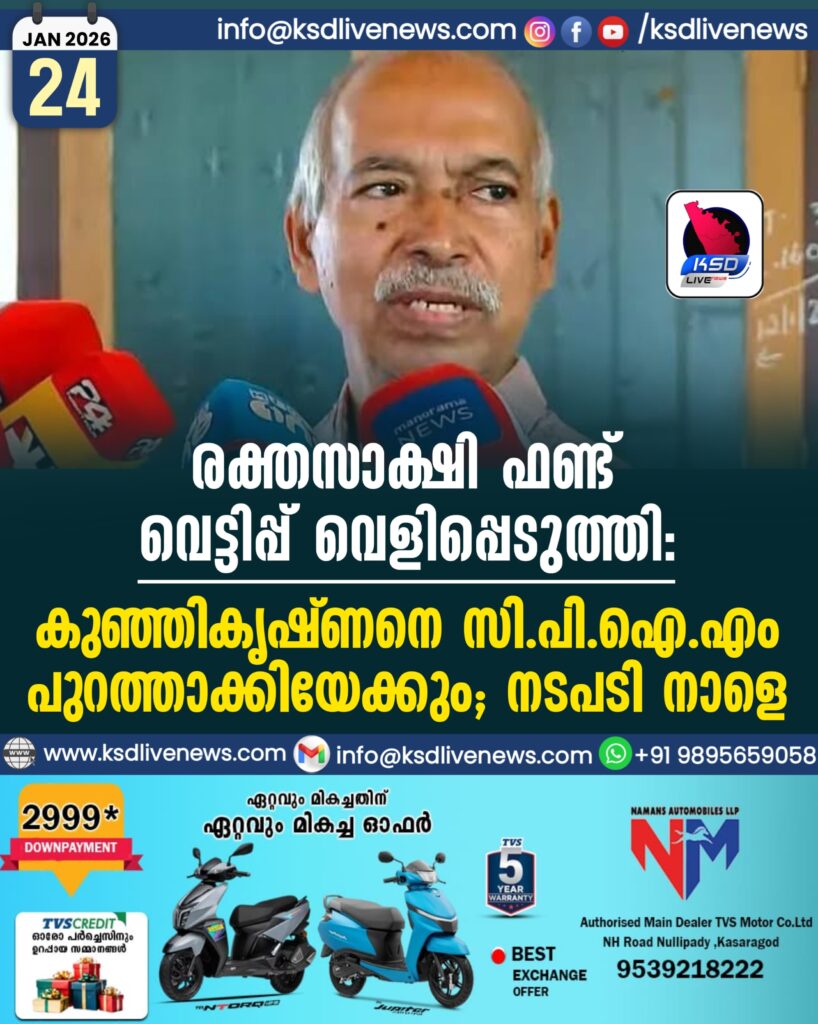 രക്തസാക്ഷി ഫണ്ട് വെട്ടിപ്പ് വെളിപ്പെടുത്തി: കുഞ്ഞികൃഷ്ണനെ സിപിഐഎം പുറത്താക്കിയേക്കും; നടപടി നാളെ