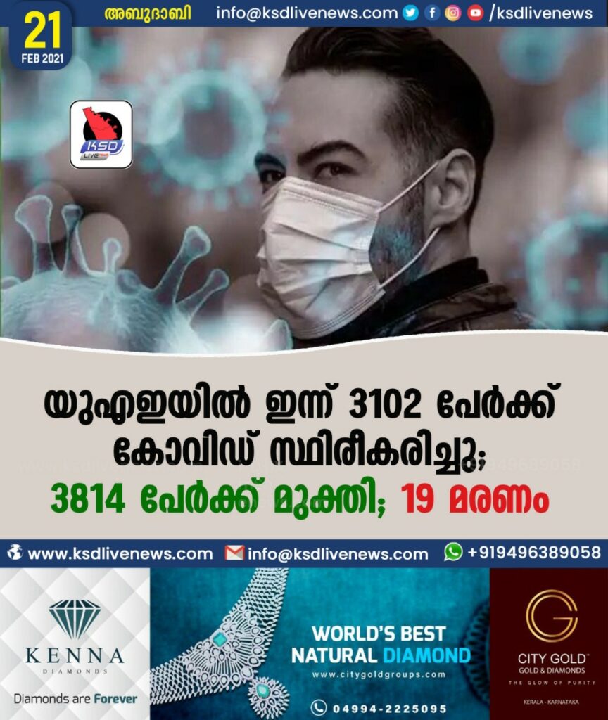 യുഎഇയില്‍ ഇന്ന് 3102 പേർക്ക് കോവിഡ് സ്ഥിരീകരിച്ചു; 3814 പേർക്ക് മുക്തി ; 19 മരണം