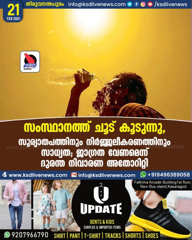 സംസ്ഥാനത്ത് ചൂട് കൂടുന്നു , സൂര്യാതപത്തിനും നിർജ്ജലീകരണത്തിനും സാധ്യത ; ജാഗ്രത വേണമെന്ന് ദുരന്ത നിവാരണ അതോറിറ്റി