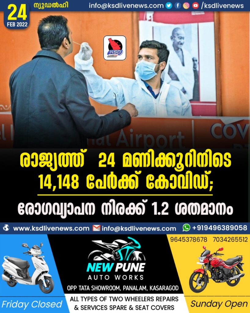 രാജ്യത്ത് 24 മണിക്കൂറിനിടെ 14,148 പേര്‍ക്ക് കോവിഡ്; രോഗവ്യാപന നിരക്ക് 1.2 ശതമാനം