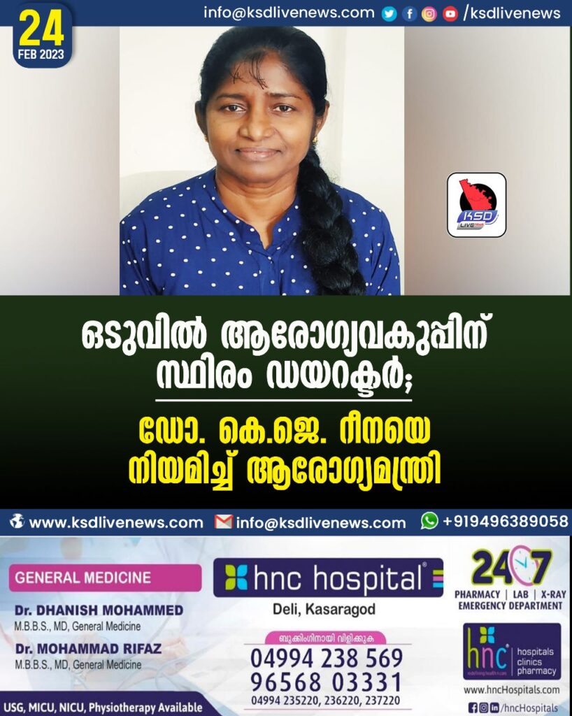 ഒടുവിൽ ആരോഗ്യവകുപ്പിന് സ്ഥിരം ഡയറക്ടർ; ഡോ. കെ.ജെ. റീനയെ നിയമിച്ച് ആരോഗ്യമന്ത്രി