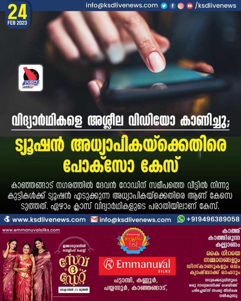 കാഞ്ഞങ്ങാട് ∙ വിദ്യാർഥികൾക്ക് മൊബൈൽ ഫോണിൽ അശ്ലീല വിഡിയോ കാണിച്ചെന്ന പരാതിയിൽ ട്യൂഷൻ അധ്യാപികയ്ക്കെതിരെ പൊലീസ് പോക്സോ വകുപ്പ് ചുമത്തി കേസെടുത്തു. കാഞ്ഞങ്ങാട് നഗരത്തിൽ ദേവൻ റോഡിന് സമീപത്തെ വീട്ടിൽ നിന്നു കുട്ടികൾക്ക് ട്യൂഷൻ എടുക്കുന്ന അധ്യാപികയ്ക്കെതിരെ ആണ് കേസെടുത്തത്. ഏഴാം ക്ലാസ് വിദ്യാർഥികളുടെ പരാതിയിലാണ് കേസ്. 4 കുട്ടികളാണ് പരാതി നൽകിയത്. സംഭവത്തിൽ അധ്യാപികയ്ക്കെതിരെ 3 കേസുകളാണ് പൊലീസ് എടുത്തത്. കഴിഞ്ഞ 2 മാസത്തിനിടെ ആണ് സംഭവം. സ്കൂൾ അധ്യാപകർ സംഭവം അറിഞ്ഞതോടെ ആണ് പൊലീസിൽ പരാതിയെത്തിയത്.