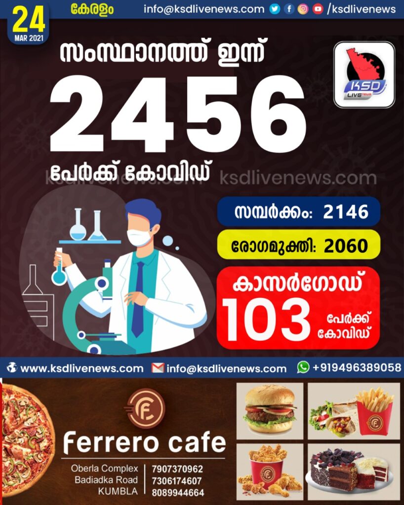 കാസർഗോഡ് ജില്ലയിൽ ഇന്ന് 103 പേർക്ക് കോവിഡ് സ്ഥിരീകരിച്ചു. സമ്പർക്കം വഴി 100 പേർക്കും. 91 പേർക്ക് രോഗമുക്തിSHARE THIS ONകാസർഗോഡ് ജില്ലയിൽ ഇന്ന് 103 പേർക്ക് കോവിഡ് സ്ഥിരീകരിച്ചു. സമ്പർക്കം വഴി 100 പേർക്കും. 91 പേർക്ക് രോഗമുക്തി