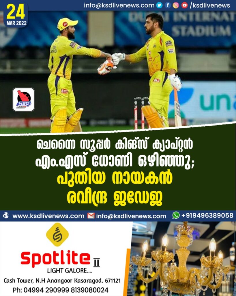 ഐപിഎല്‍ ടീം ചെന്നൈ സൂപ്പര്‍ കിങ്‌സ് നായക പദവി ഒഴിഞ്ഞ് എം.എസ് ധോണി. പുതിയ സീസണില്‍ ഇന്ത്യന്‍ താരം രവീന്ദ്ര ജഡേജയാകും ടീമിനെ നയിക്കുകയെന്ന് ചെന്നൈ സൂപ്പര്‍ കിങ്‌സ് സ്ഥിരീകരിച്ചു. സമൂഹമാധ്യമങ്ങളിലൂടെയാണ് ധോണിയില്‍നിന്ന് നായകസ്ഥാനം ജഡേജ ഏറ്റെടുക്കുന്ന വിവരം ചെന്നൈ സൂപ്പര്‍ കിങ്‌സ് പരസ്യമാക്കിയത്.
