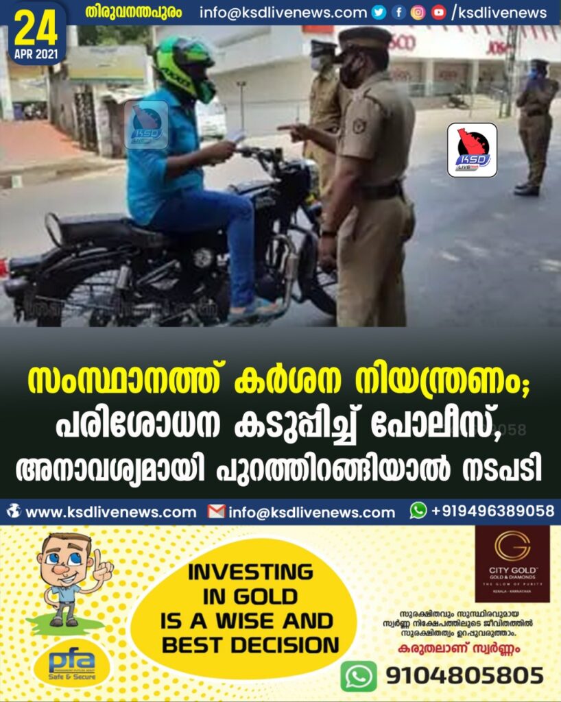 സംസ്ഥാനത്ത് കർശന നിയന്ത്രണം; പരിശോധന കടുപ്പിച്ച് പോലീസ്, അനാവശ്യമായി പുറത്തിറങ്ങിയാല് നടപടി