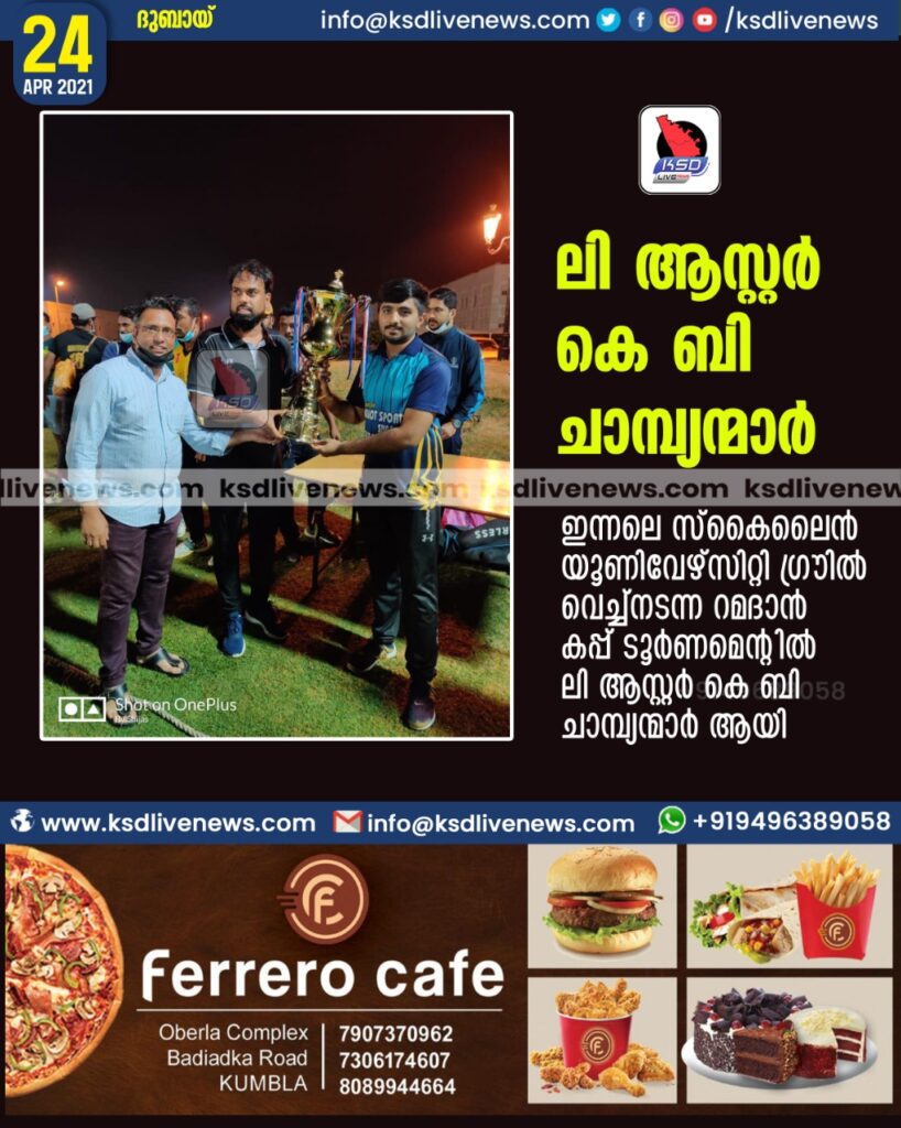 ഇന്നലെ സ്കൈലൈൻ യൂണിവേഴ്സിറ്റി ഗ്രൗണ്ടിൽ വെച്ച് നടന്ന റമദാൻ കപ്പ് ടൂർണമെന്റിൽ ലി ആസ്റ്റർ കെ ബി ചാമ്പ്യന്മാർ ആയി..