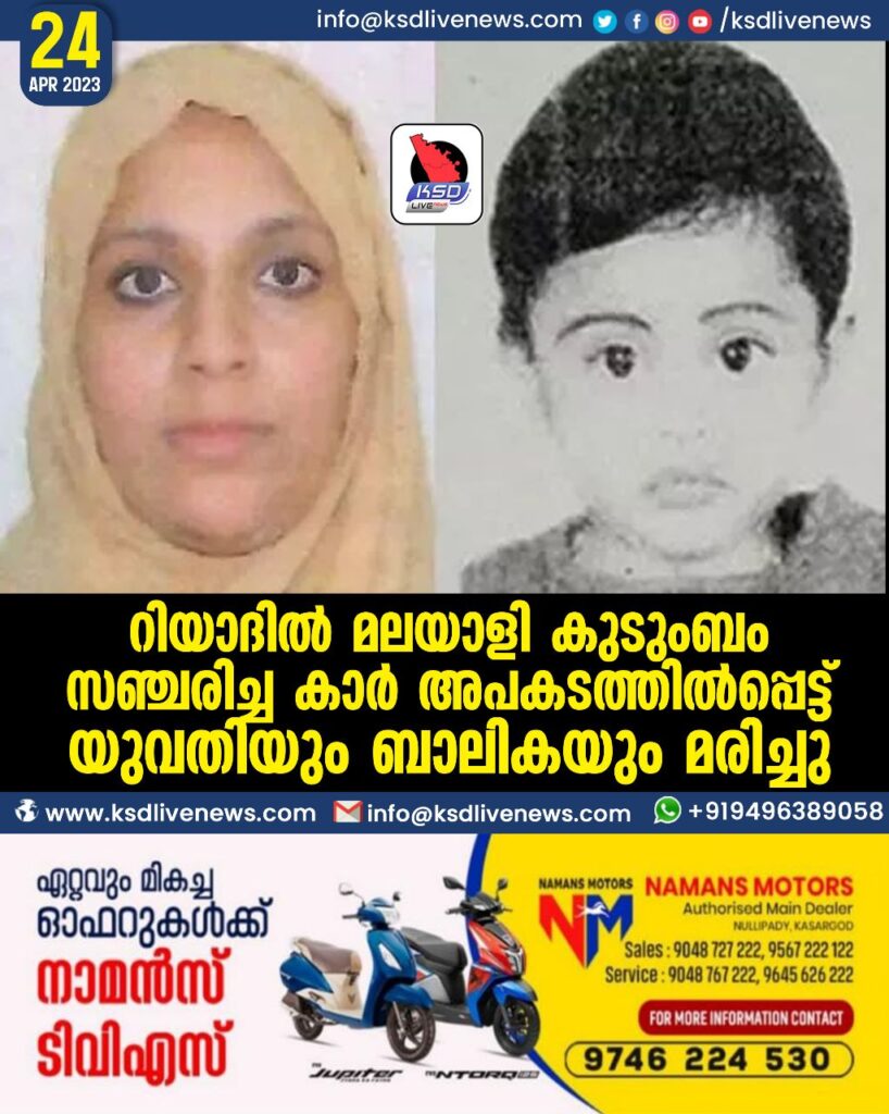 റിയാദില് മലയാളി കുടുംബം സഞ്ചരിച്ച കാര് അപകടത്തില്പ്പെട്ട് യുവതിയും ബാലികയും മരിച്ചു