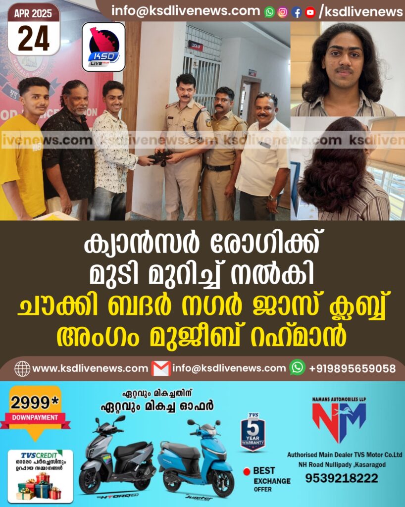 കേശദാനം മഹാദാനം താൻ ഓമനിച്ച് വളർത്തിയ മുടി ക്യാൻസർ രോഗികൾക്ക് കൈമാറുന്നതിന് കാസറഗോഡ് സബ് ഇൻസ്പെക്ടർ സജിമോൻ ജോർജ്ന് കൈമാറി ചൗക്കി ജാസ് ക്ലബ്ബ് അംഗം മുജീബ് റഹ് മാൻ. കാസറഗോഡ് പോലീസ് സ്റ്റേഷനിൽ വെച്ച് പൊതു പ്രവർത്തകൻ കരീം ചൗക്കിയുടെ സാനിദ്യത്തിലാണ് കൈമാറിയത്. ജനമൈത്രി ബീറ്റ് ഓഫീസർ സന്തോഷ്. സമദ് ബണ്ടി.സയ്യിദ് അൻവാഇസ് സംബന്ധിച്ചു….