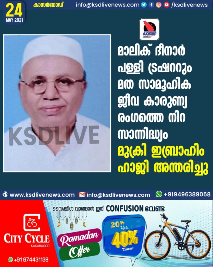മാലിക് ദീനാർ പള്ളി ട്രഷററും മത സാമൂഹിക ജീവ കാരുണ്യ രംഗത്തെ നിറ സാന്നിദ്ധ്യം മുക്രി ഇബ്രാഹിം ഹാജി അന്തരിച്ചു